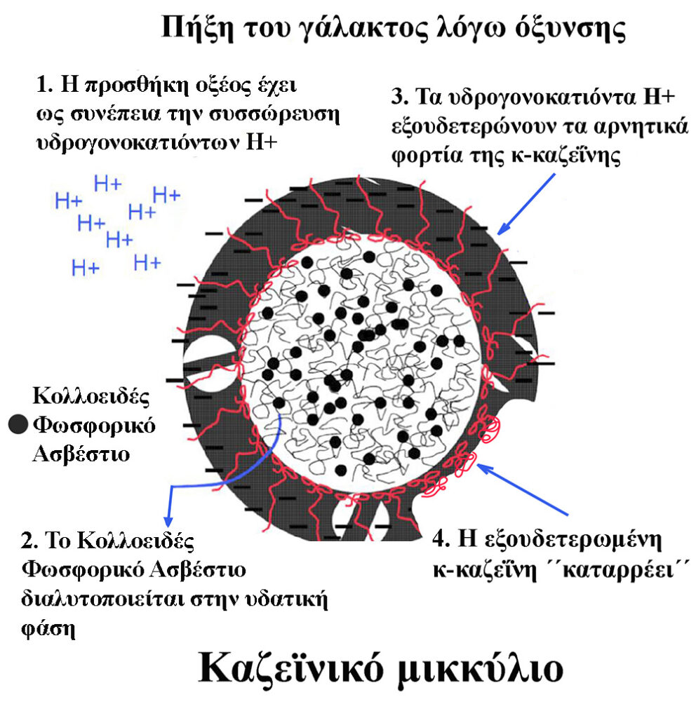 Η όξυνση, του γάλακτος, δηλαδή, η πτώση της τιμής, του pH, του, γάλακτος, οδηγεί τα καζεϊνικά μικκύλια σε αποσταθεροποίηση, και, τελικά, σε συσσωμάτωση, μεταξύ τους.