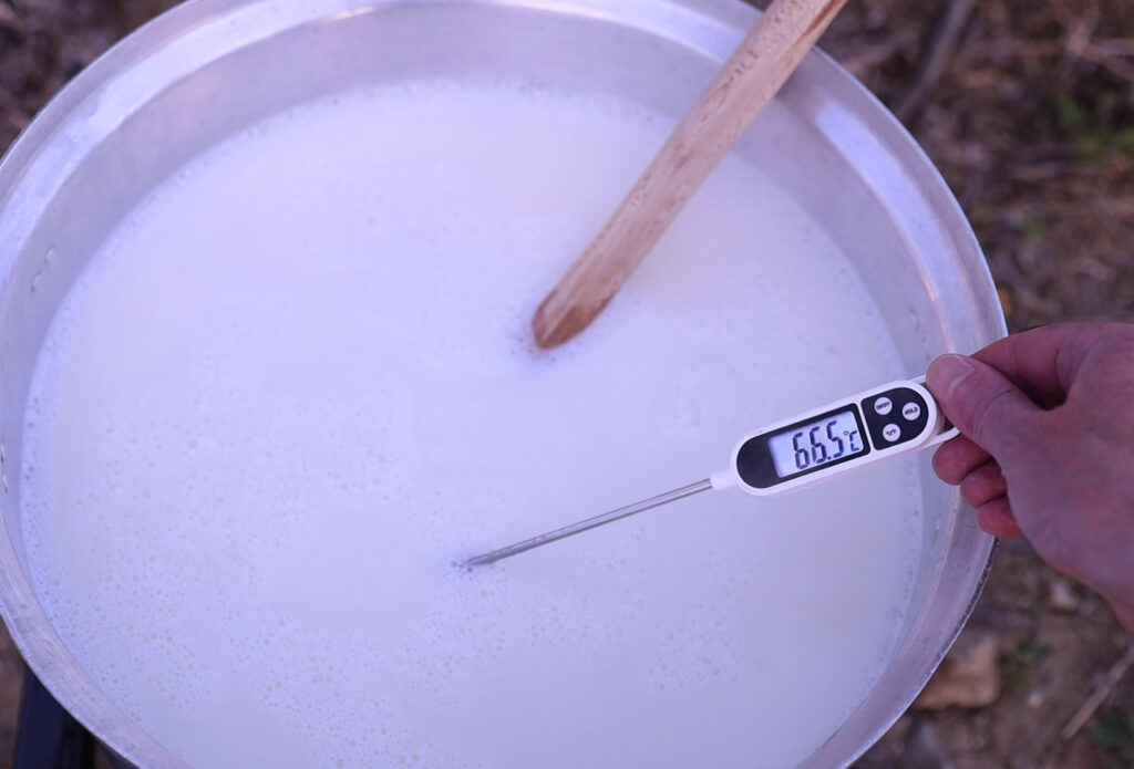 Η θέρμανση του τυρογάλακτος γίνεται υπό συνεχή ήπια ανάδευση μέχρι τη θερμοκρασία των 80 – 85°C.